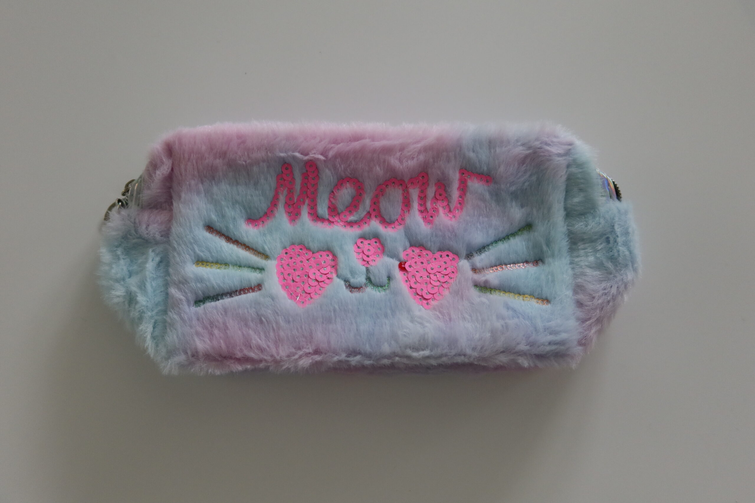 Cute faux fur cat small toiletry bag featuring bright colors and cat design. Perfect for carrying a toothbrust, toothpaste and any other overnight needs.