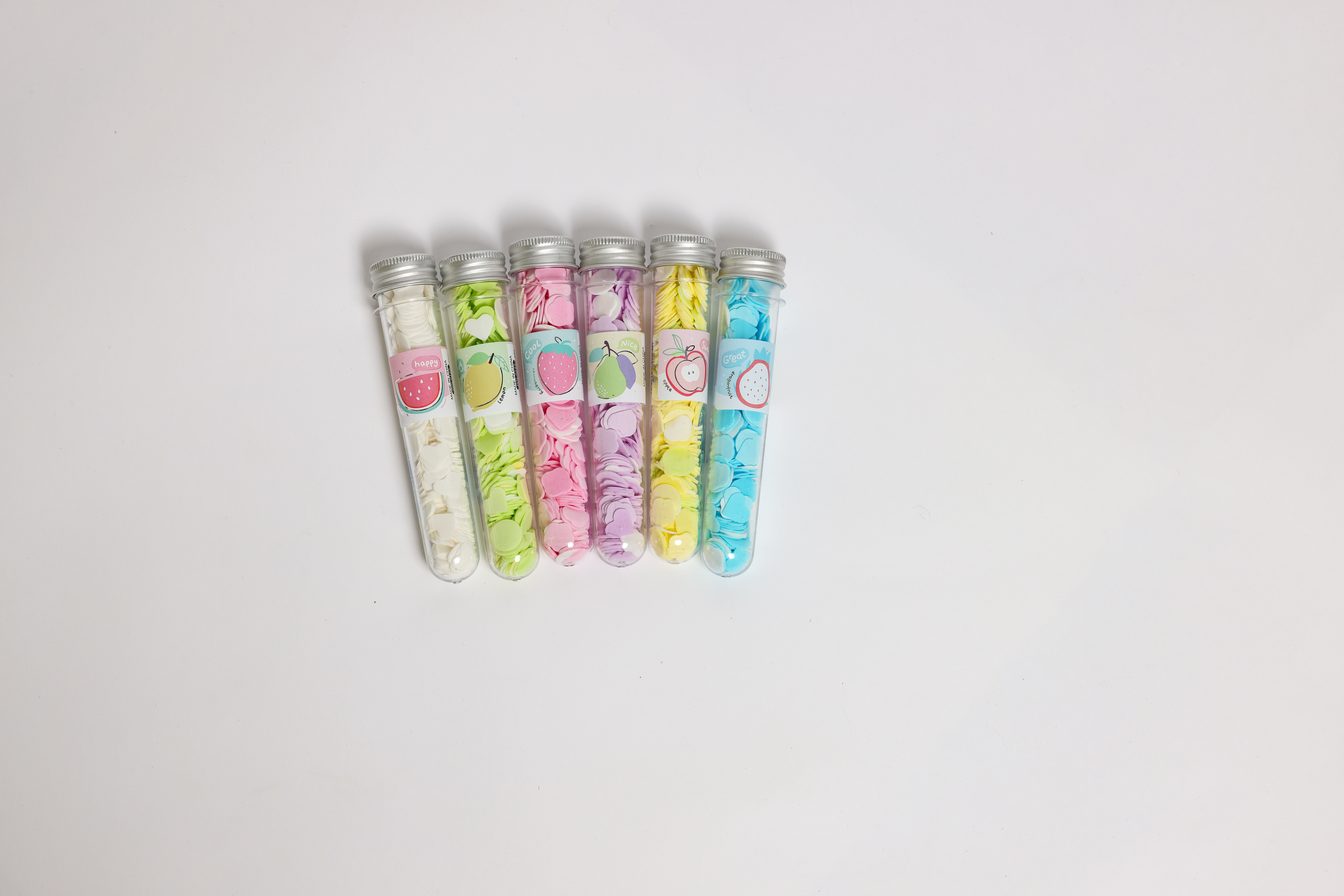 Portable hand soap confetti flakes. Perfect for washing hands on the go. Featuring fruit flavored scents. Scent randomly selected.