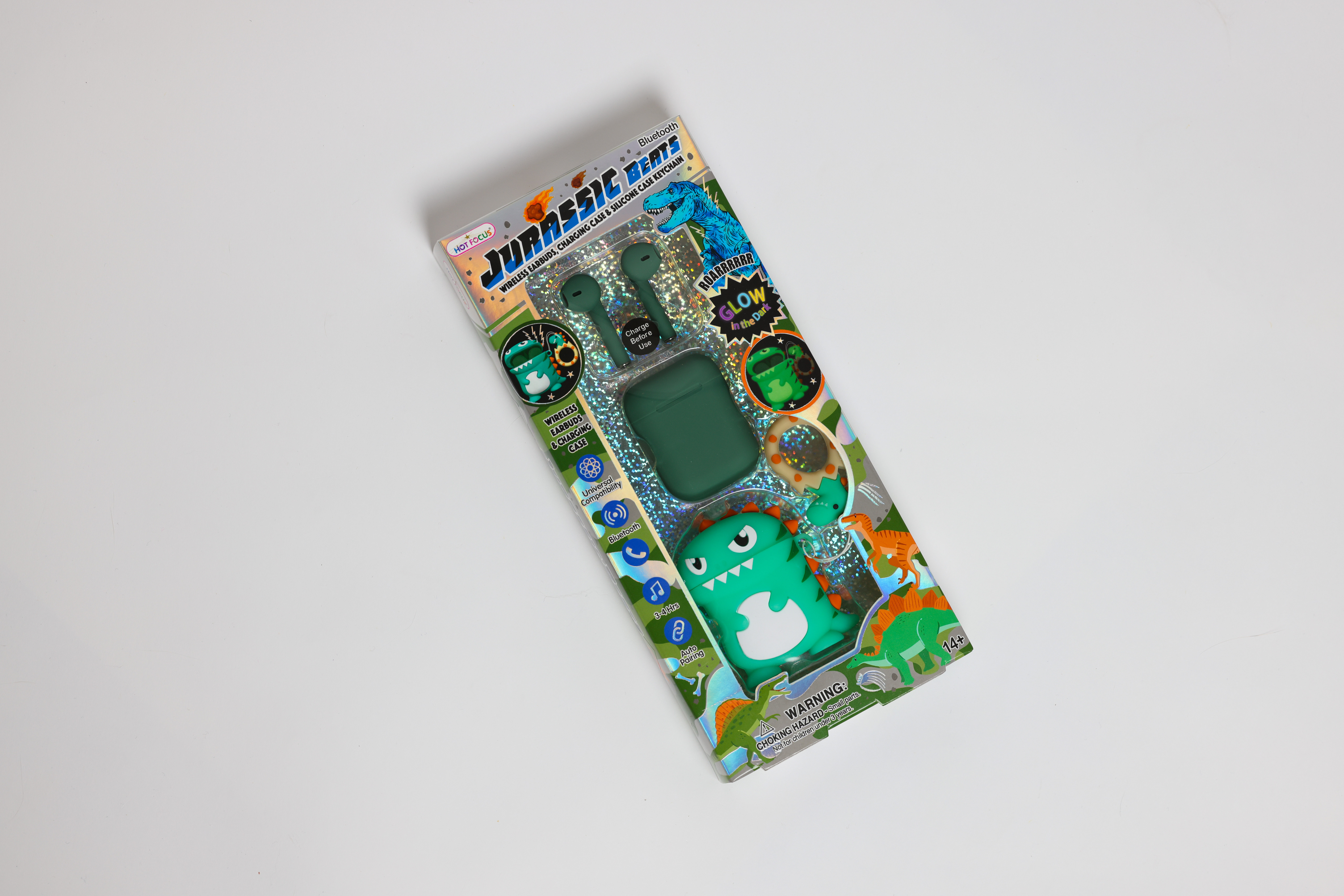 Dinosaur design wireless earbuds with charging case and case keychain.